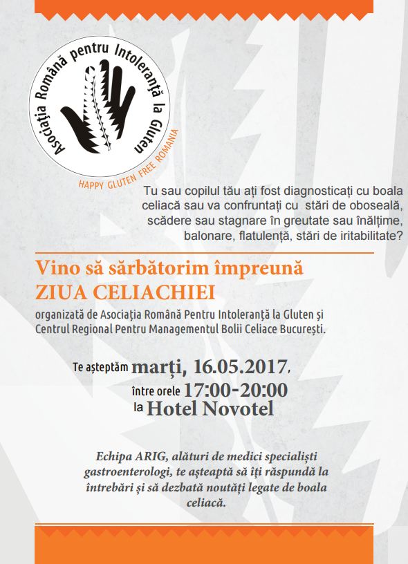 Tu sau copilul tau ati fost diagnosticati cu boala celiaca sau va confruntati cu stari de oboseala, scadere sau stagnare in greutate sau inaltime, balonare, flatulenta, stari de iritabilitate? Te asteptam marti, 16.05.2017, intre orele 17:00-20:00, la Hotel Novotel.