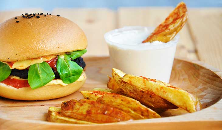 Daca ai pofta de fast-food, atunci iti recomand o varianta mai sanatoasa, dar la fel de gustoasa – burger cu fasole neagra si cartofi wedges copti!