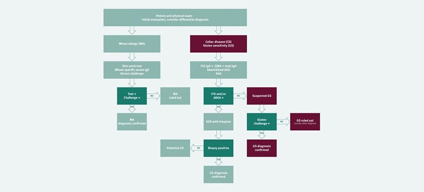 Prima saptamana o sa fie de incercare, urmata in urmatoarea sapamana de o dieta stricta fara gluten, dupa care inca o saptamana de incercare. Protocolul standardizat de diagnostic trebuie utilizat pentru evaluarea saptamanala a simptomelor.